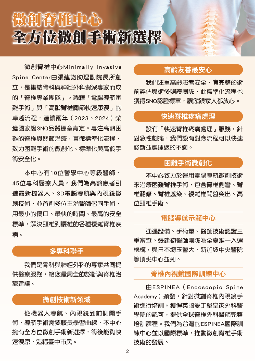 微創脊椎中心Minimally Invasive Spine Center由張建鈞助理副院長所創立,是集結骨科與神經外科資深專家而成的「脊椎專業團隊」。憑藉「電腦導航困難手術」與「高齡脊椎關節快速康復」的卓越流程,連續兩年(2023、2024)榮獲國家級SNQ品質標章肯定。專注高齡困難的脊椎與關節治療,貫徹標準化流程,致力困難手術的微創化、標準化與高齡手術安全化。