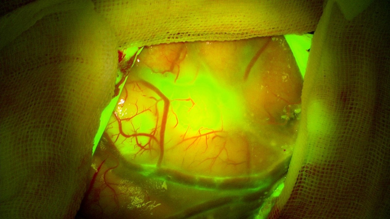 圖三、術前惡性腫瘤與正常腦組織邊界依賴黃螢光區分
