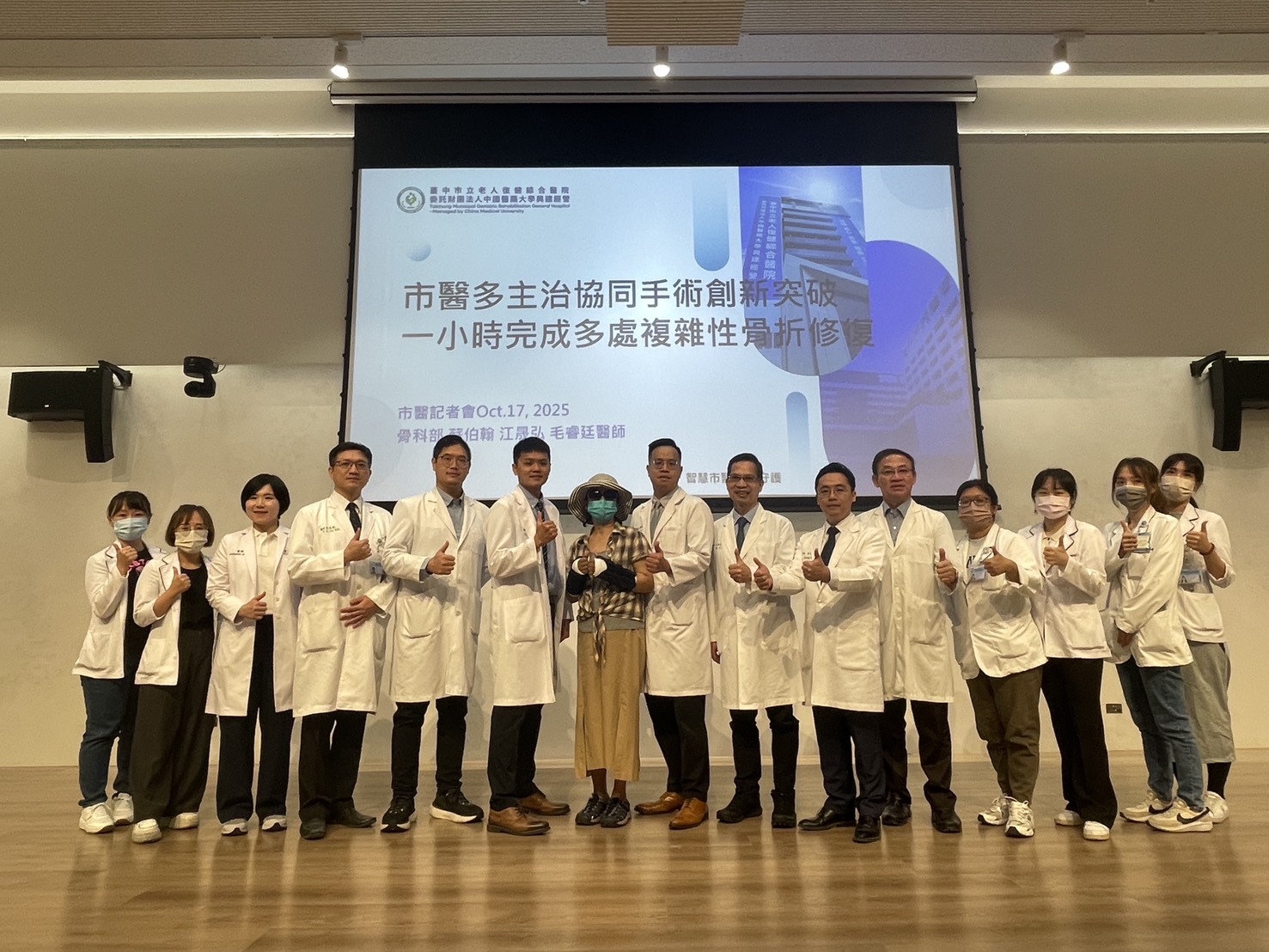 圖說二、中國醫藥大學附設醫院骨科部部長陳賢德醫師(右七)協助指導市立醫院建立堅強的骨科部團隊,由張建鈞副院長(右六)領軍、蘇伯翰醫師(左六)、江晟弘醫師(右八)等與病患合影。
