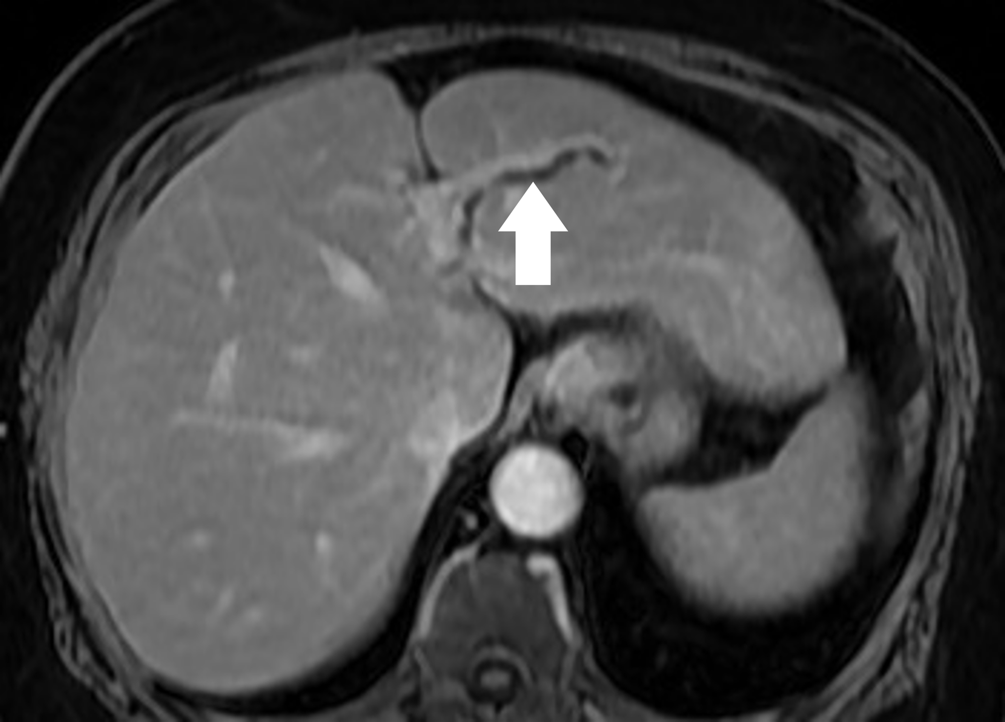 圖說二、核磁共振顯示異常擴張的左肝內膽管。