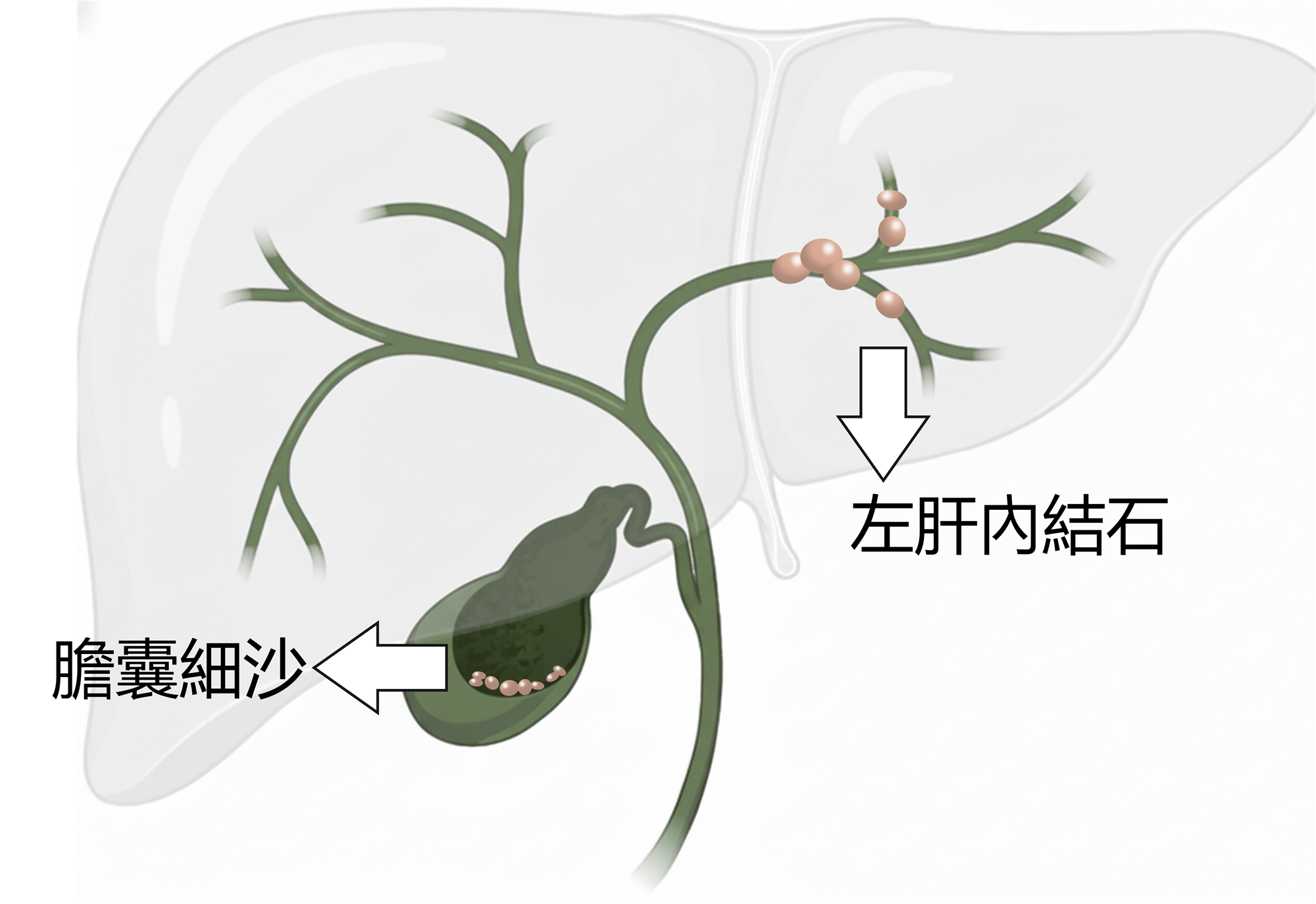 圖說三、患者左肝內膽管結石造成慢性膽管炎,合併膽囊內細沙造成慢性膽囊炎。