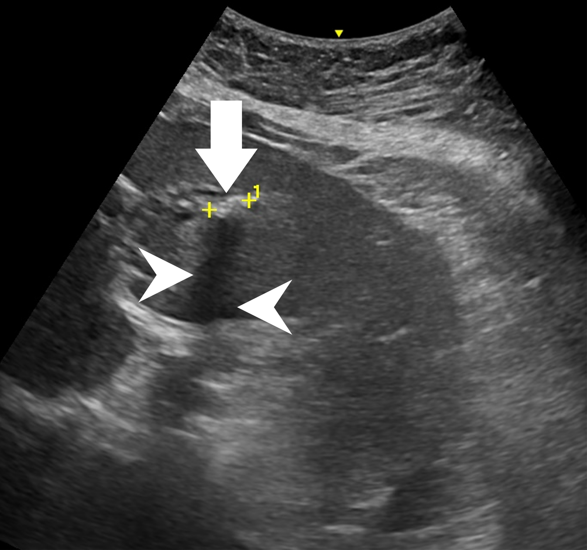圖說一、腹部超音波顯示左肝內膽管結石及結石造成的陰影。