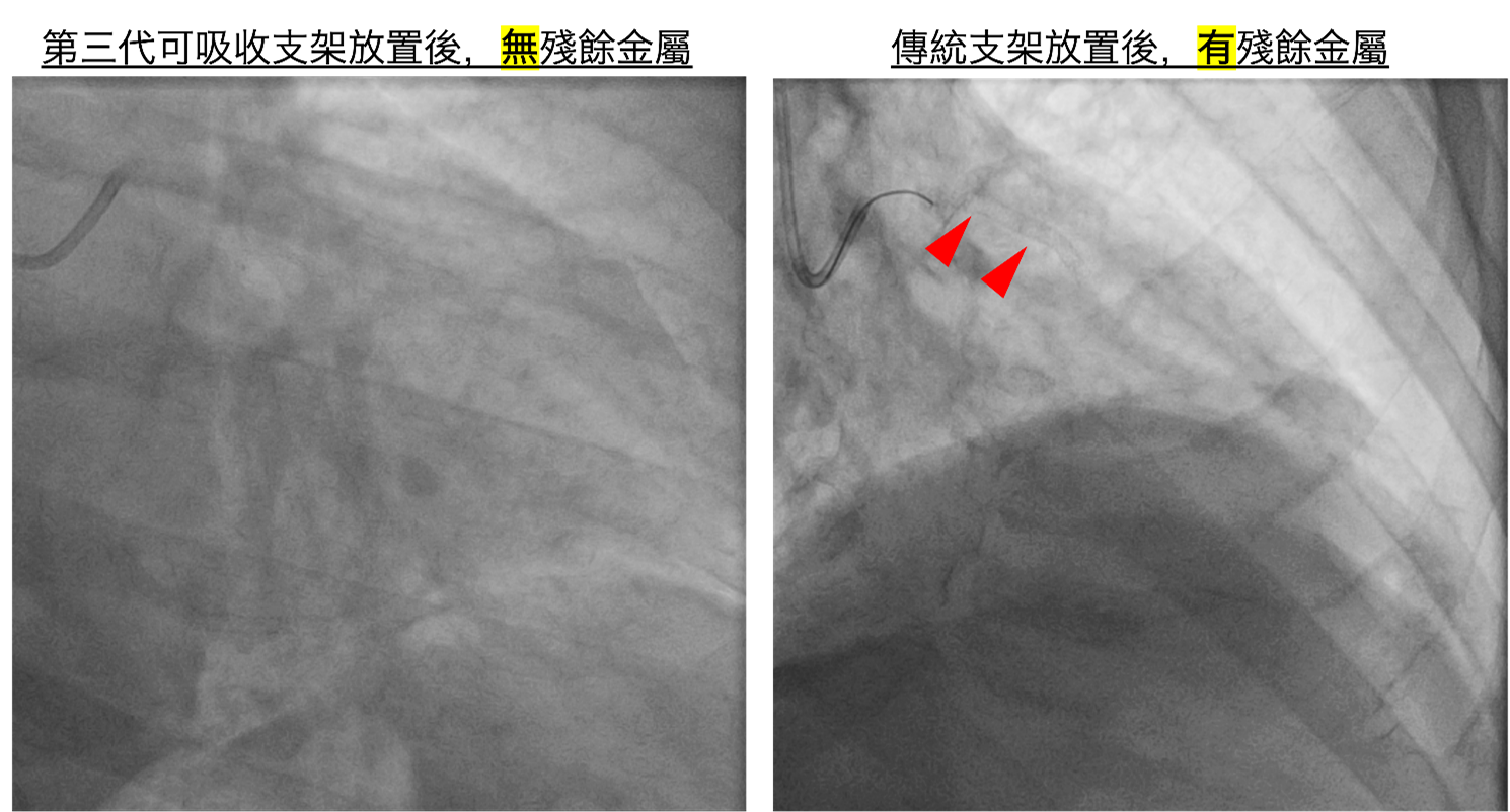 年輕患者若以傳統金屬支架治療,血管會因永久性金屬結構而失去自然舒縮能力。第三代鎂合金可吸收支架初期能穩定撐開血管,一年內約99%會被身體吸收,不會殘留異物或造成長期發炎,對保留未來血管健康十分有利。但前提須血管無嚴重鈣化、長度短、無大分支之情形,才能評估使用。