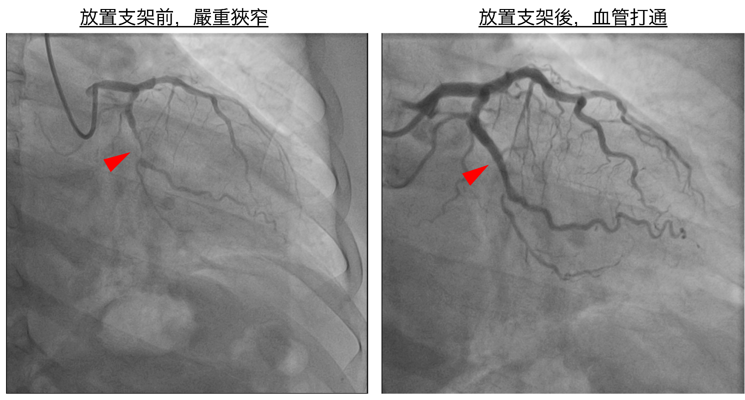 圖一、放置支架前,患者血管嚴重狹窄(左),術後血管打通(右)。