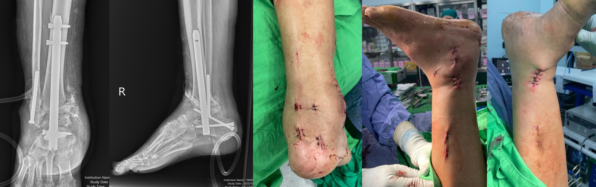 雖然整體手術時間延長至將近7 小時,但透過關節鏡,我們得以徹底清除壞死組織,將關節面磨至出血骨面,並將原本鬆脫的內踝骨塊研碎後填入融合區作為自體骨移植,提升骨癒合成功率。這樣高度複雜且耗時的手術,仰賴骨科醫師、麻醉與手術室護理團隊的高度默契與耐心合作,才能順利完成。