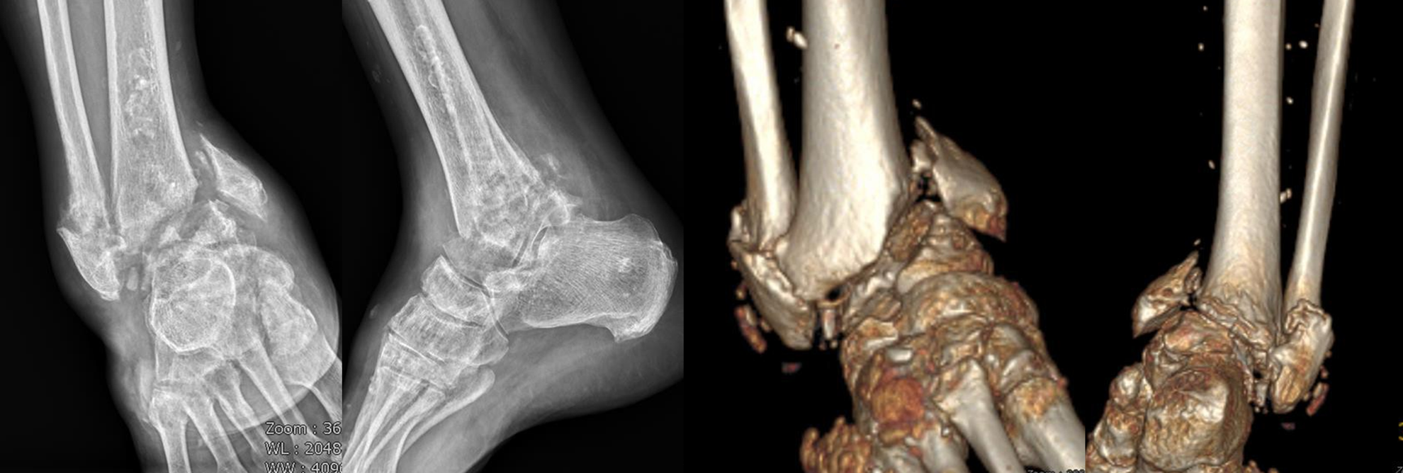 52 歲男性病人,本身有痛風及糖尿病。今年五月右腳踝骨折後未接受適當治療,逐漸導致骨折癒合錯位(malunion)、關節變形(deformity)以及距骨塌陷(talus collapse),行走疼痛明顯、生活品質大幅下降。