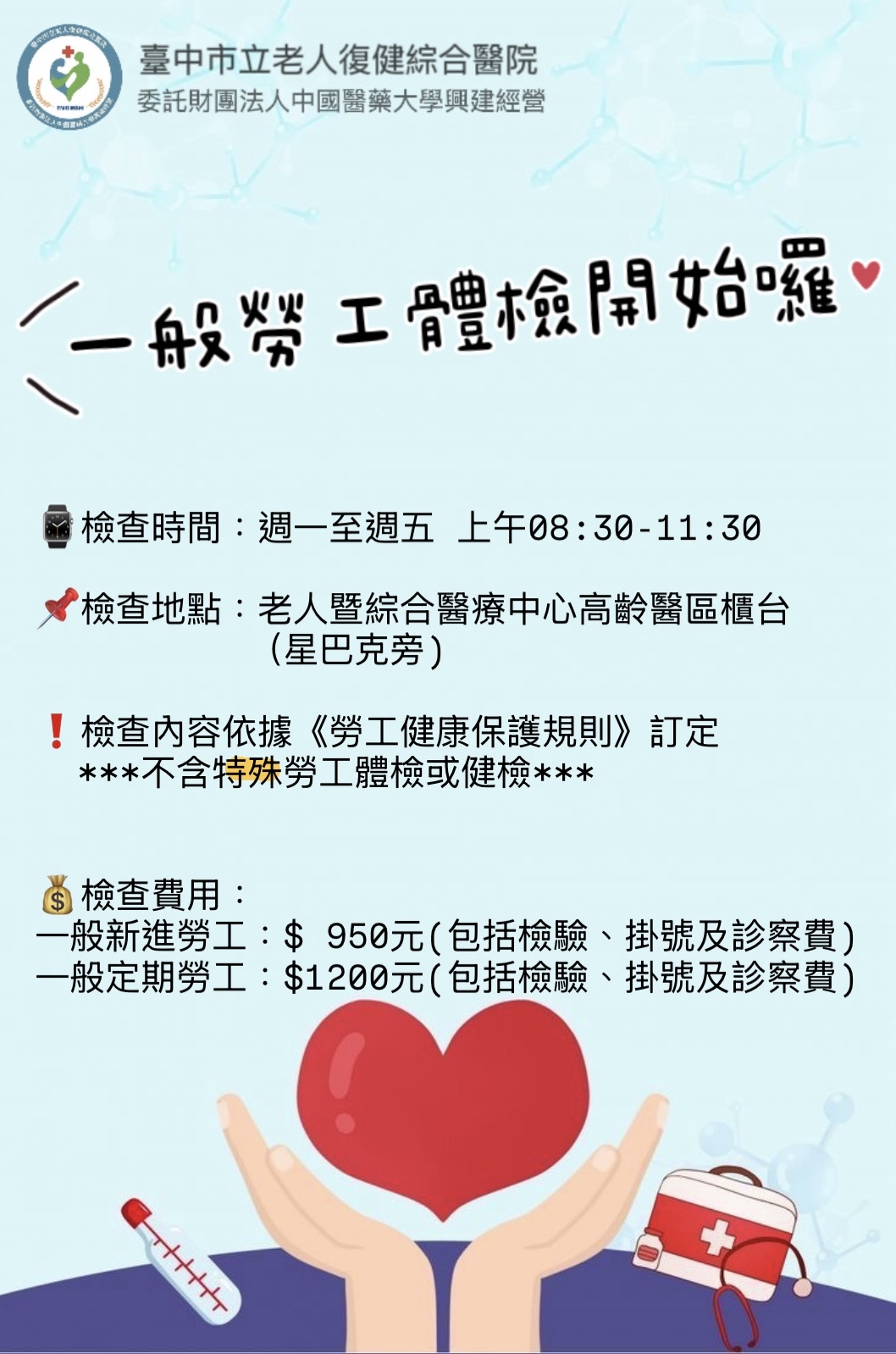 一般定期勞工:$1200元(包括檢驗、掛號及診察費)。