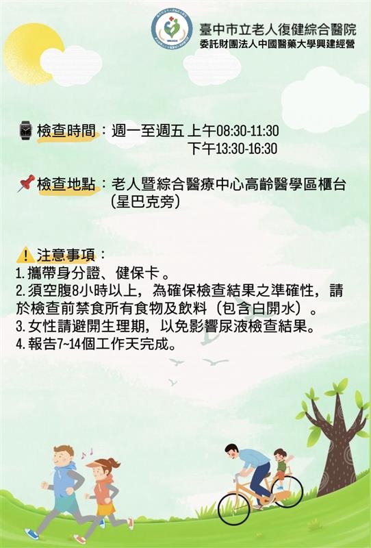 - 檢查地點:老人暨綜合醫療中心高齡醫學區櫃台(星巴克旁邊)。
