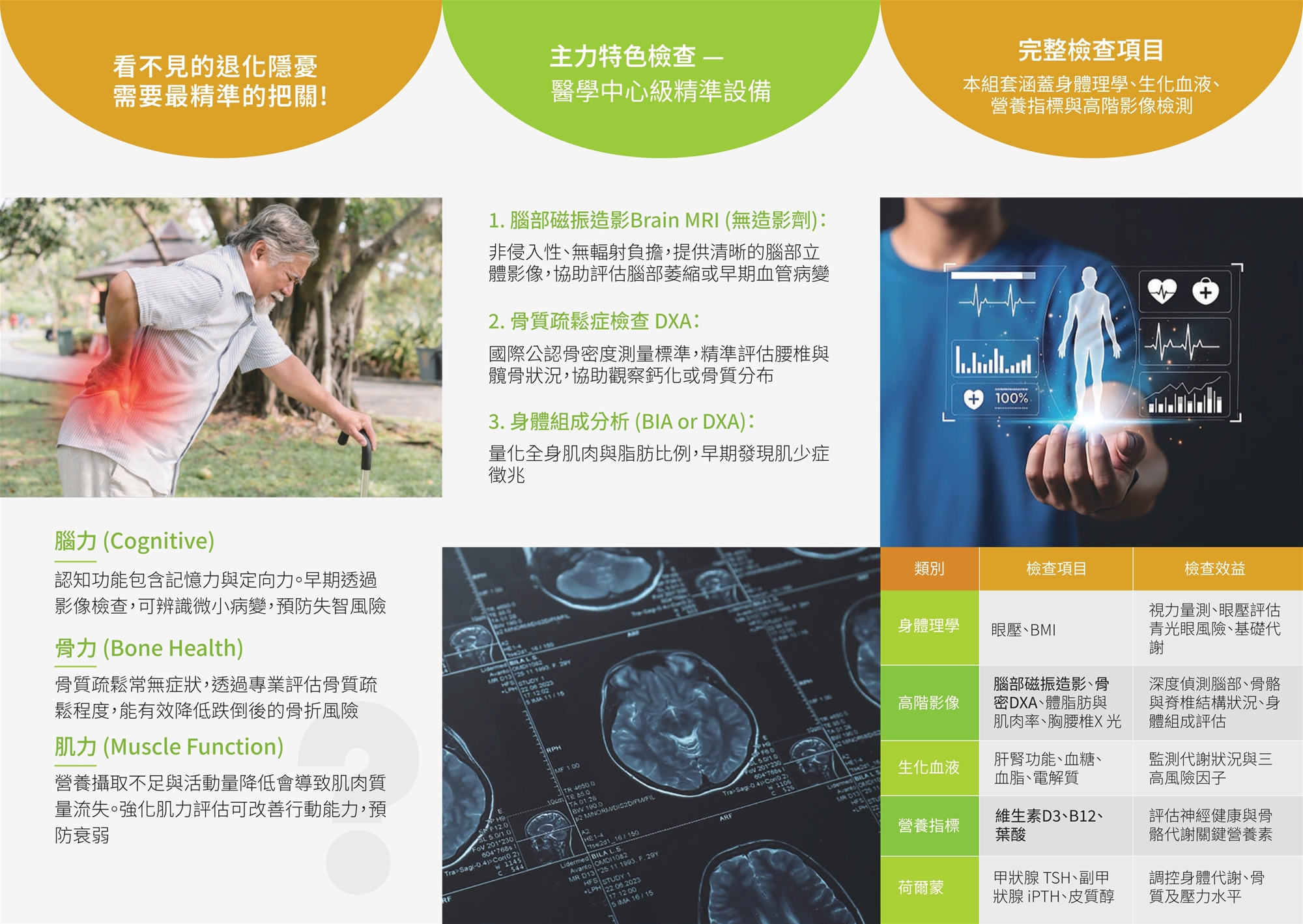 眼壓、身體脂肪與肌肉率BIA、身體質量指數BMI 血糖:醣化血色素HbA1c 血脂肪:總膽固醇TC、三酸甘油脂TG、高密度脂蛋白HDL、低密度脂蛋白LDL 肝功能:GOT(AST)、GPT(ALT) 腎功能:尿素氮BUN、肌酸酐Creatinine 電解質:鈉、鉀、鈣、鎂、磷 血液:葉酸、25-OH 維他命 D3、維生素B12、甲狀腺促素TSH、副甲狀腺賀爾蒙iPTH、C-反應蛋白hs-CRP、皮質醇Cortisol、胰島素Insulin 腦部磁振造影檢查Brain MRI(無造影劑) 骨質疏鬆症檢查DXA 胸-腰椎X光(正面+側面)