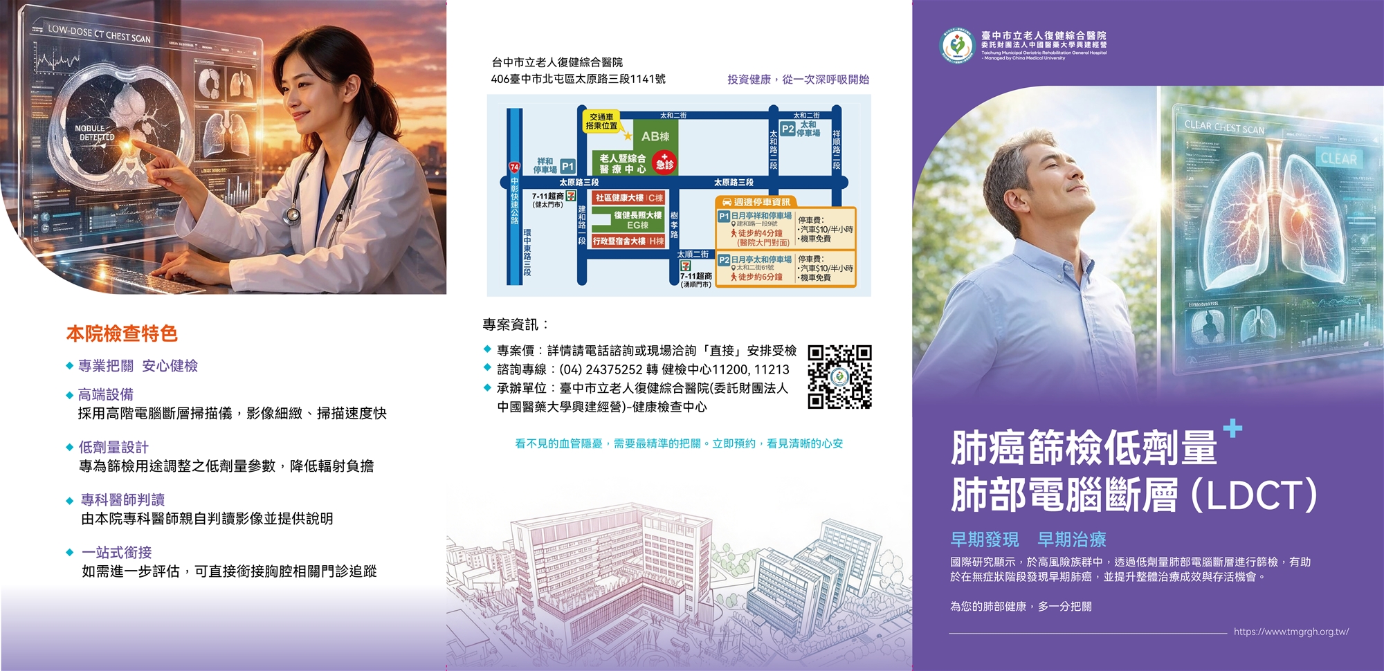 LDCT是一項快速、非侵入性的肺癌篩檢工具,可在症狀出現前發現肺部異常,並結合胸腔科醫師專業判讀與風險管理。檢查中常見的肺部小結節,多數為良性變化,但需依大小、型態與個人風險進行分級評估與追蹤,而非單次檢查即可定論。透過系統化的影像判讀與定期追蹤,掌握潛在變化,達到早期發現與安心管理的平衡。建議具風險因子的族群,歡迎與本院胸腔科醫師討論個人化篩檢與追蹤策略。