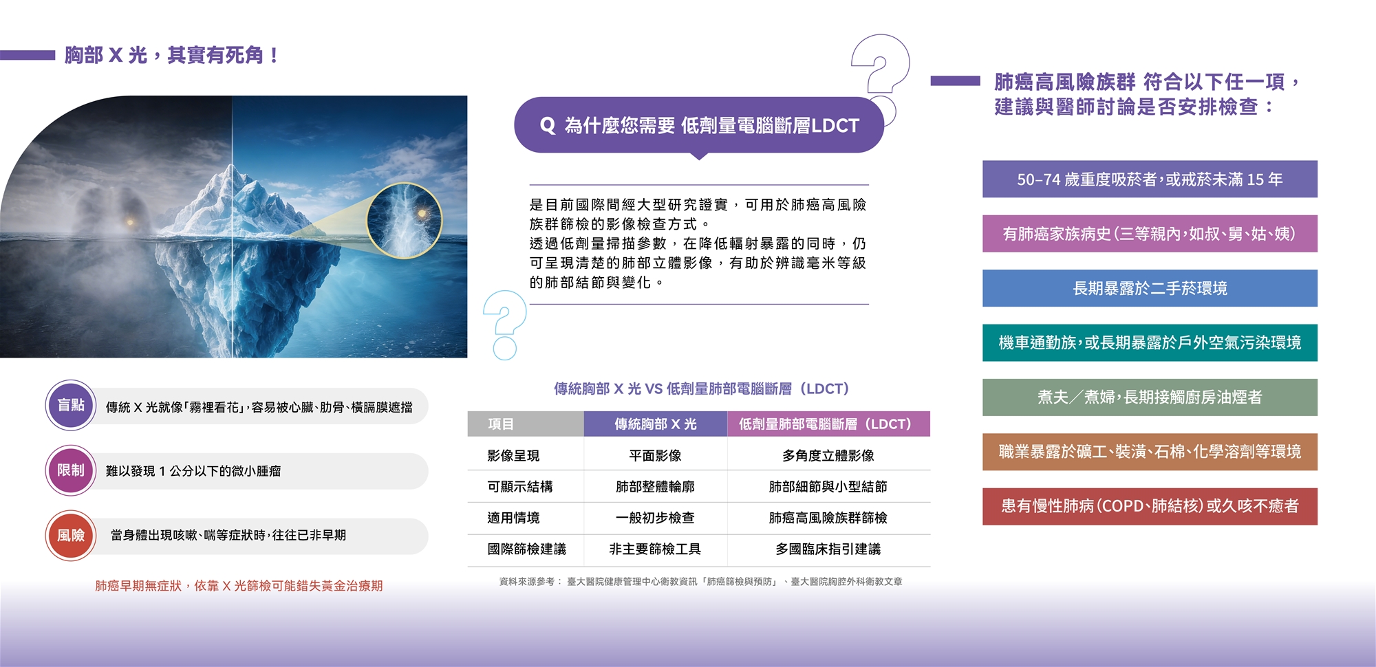 早期肺癌沒有明顯症狀,許多人等到出現咳嗽、胸悶或不適時,已錯過最佳治療時機。 若您有抽菸史、長期暴露於空污或有家族肺癌病史,可與胸腔科醫師評估是否適合LDCT檢查。
