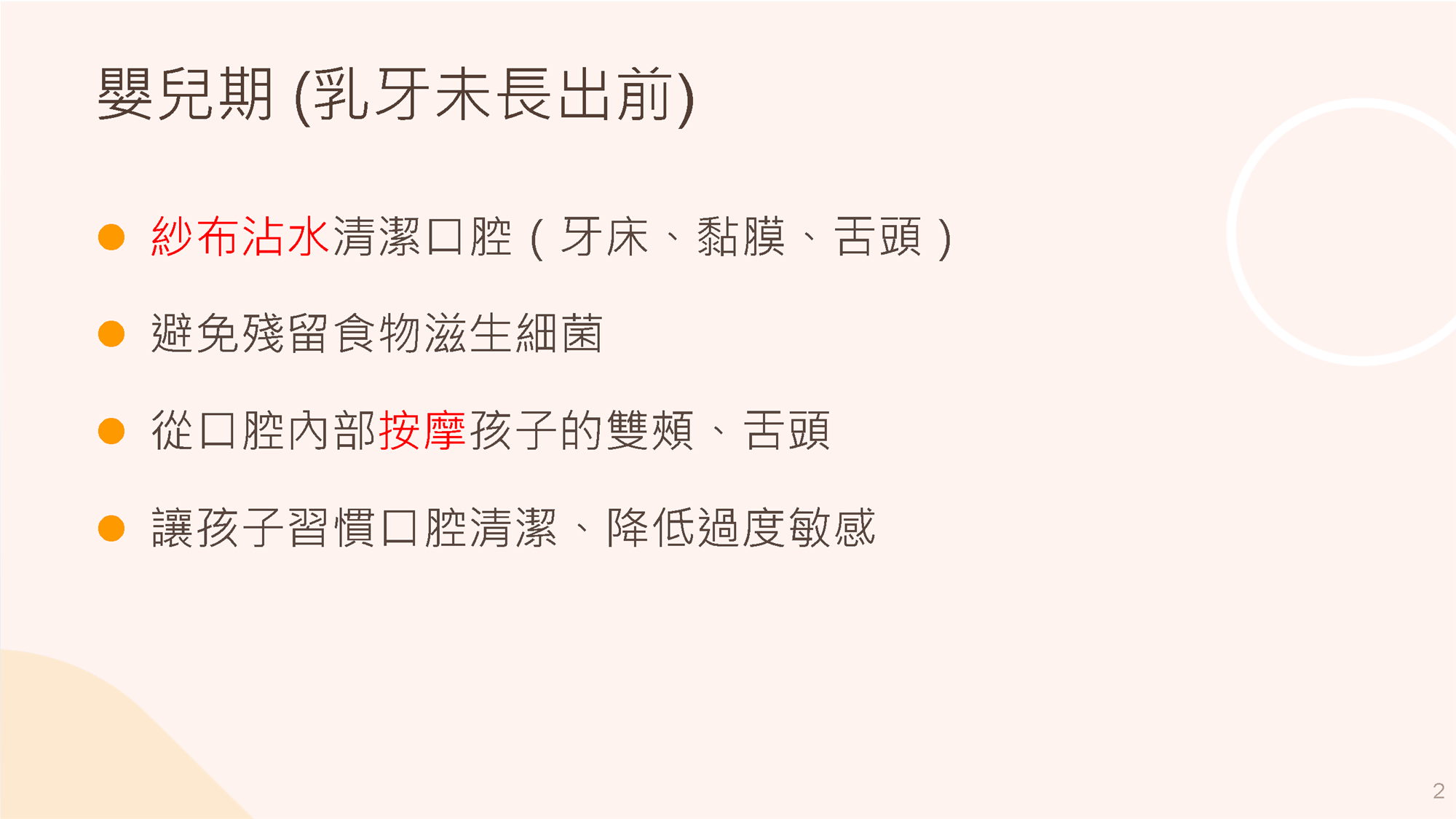 「預防勝於治療」,嬰幼兒的口腔保健應從乳牙尚未萌發前就開始。家長可使用乾淨紗布沾水,輕柔清潔寶寶的牙床、舌頭與口腔黏膜,不僅能去除殘留奶垢與細菌,也有助於降低口腔敏感度,讓孩子逐步適應清潔動作。當乳牙長出後,即可開始使用含氟牙膏進行刷牙,每天至少2次,尤其睡前清潔最為重要,並建議由家長協助刷牙至國小三年級,以確保清潔品質。