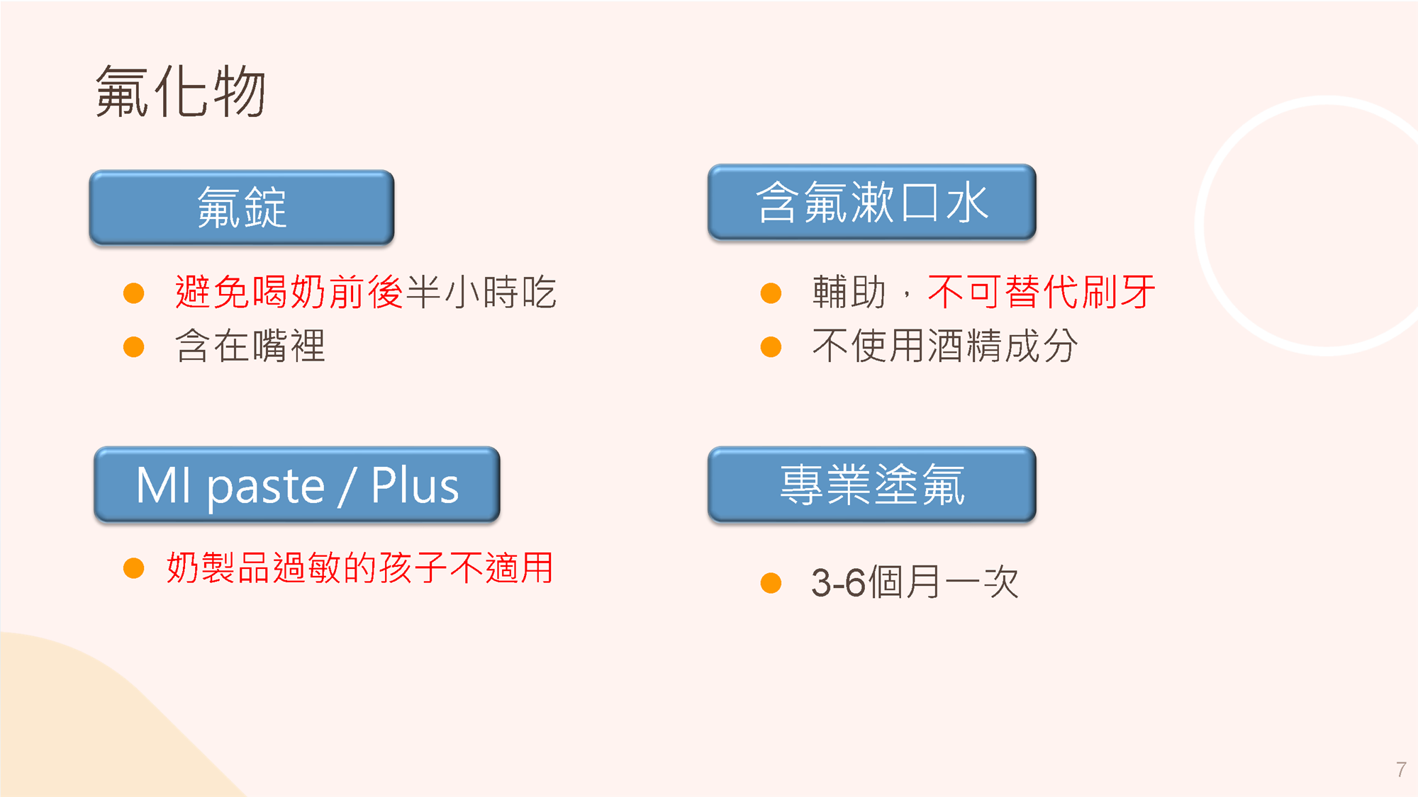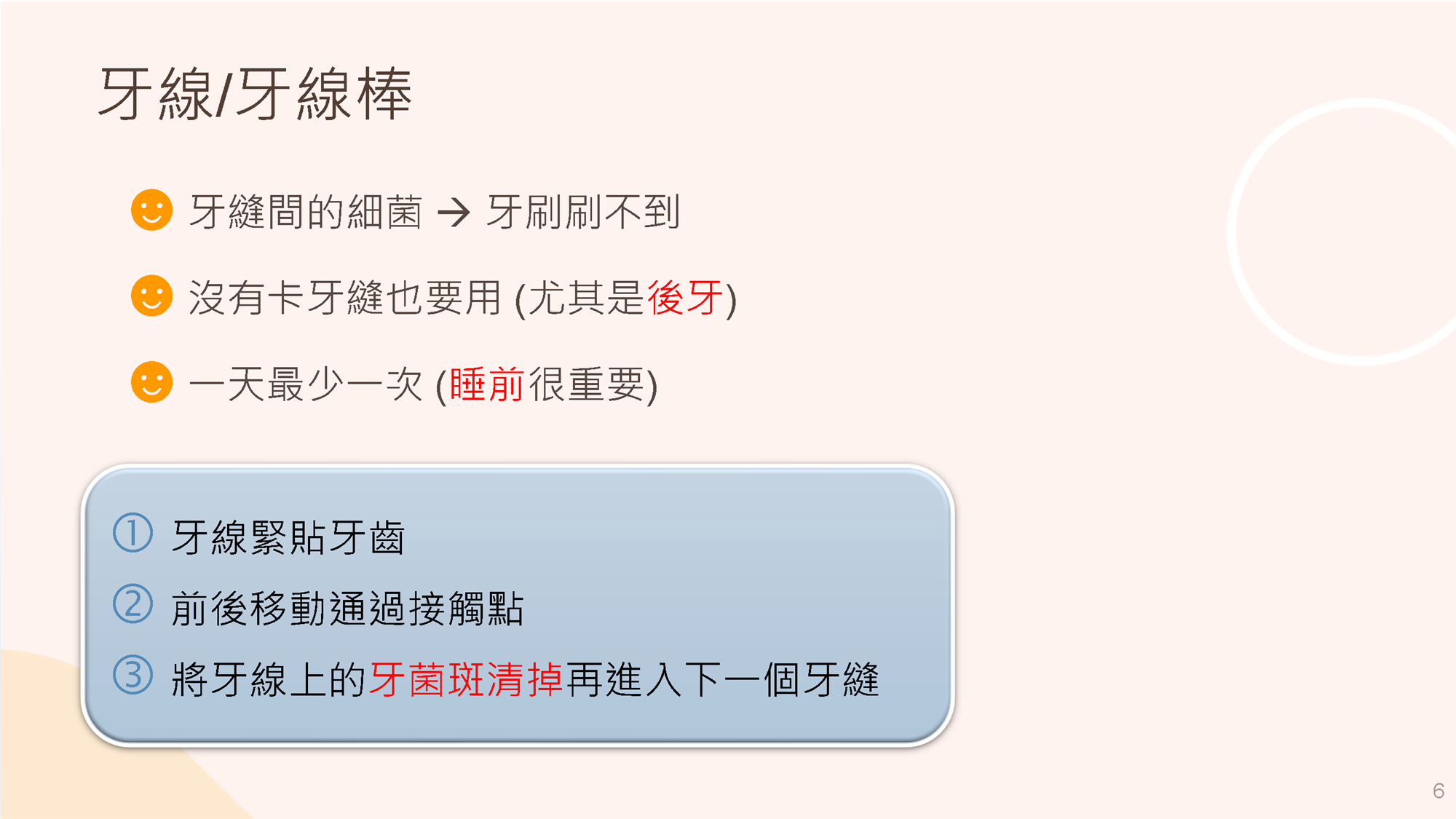除了刷牙外,牙線清潔亦不可忽略,特別是後牙牙縫,建議每天至少使用一次,以去除牙刷難以清潔的牙菌斑。此外,可依醫師建議定期進行專業塗氟(約每3至6個月一次),強化牙齒抗酸能力,但須注意氟化物僅為輔助,不能取代日常清潔。